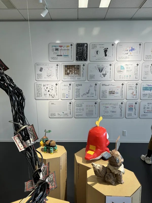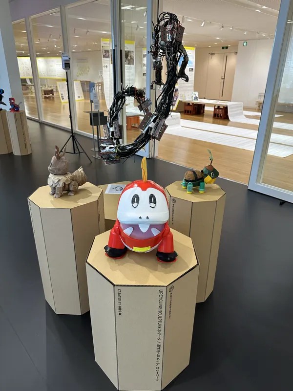廃材を材料にアップサイクルして制作しているので、ゴミ問題に関する展示も行われています。