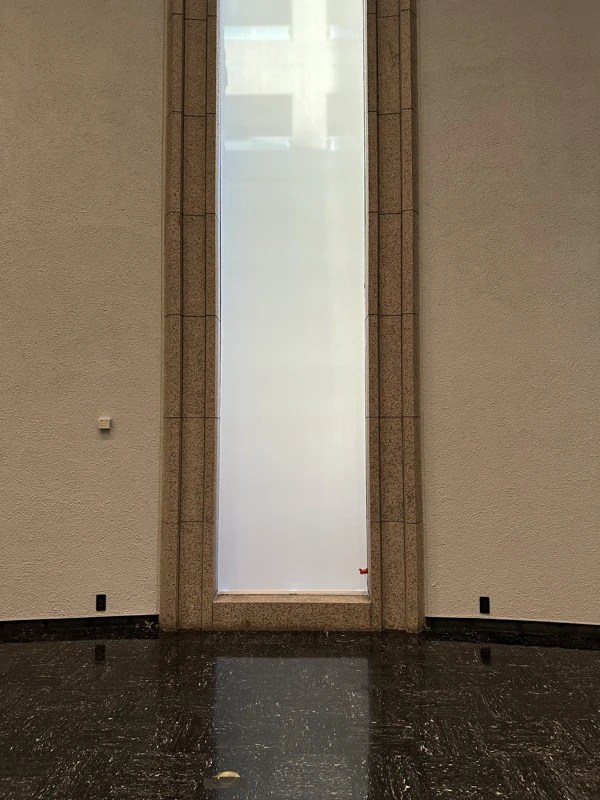 ▲1階ロビーの丸窓の外には「雑草(金)」という作品が展示されています。