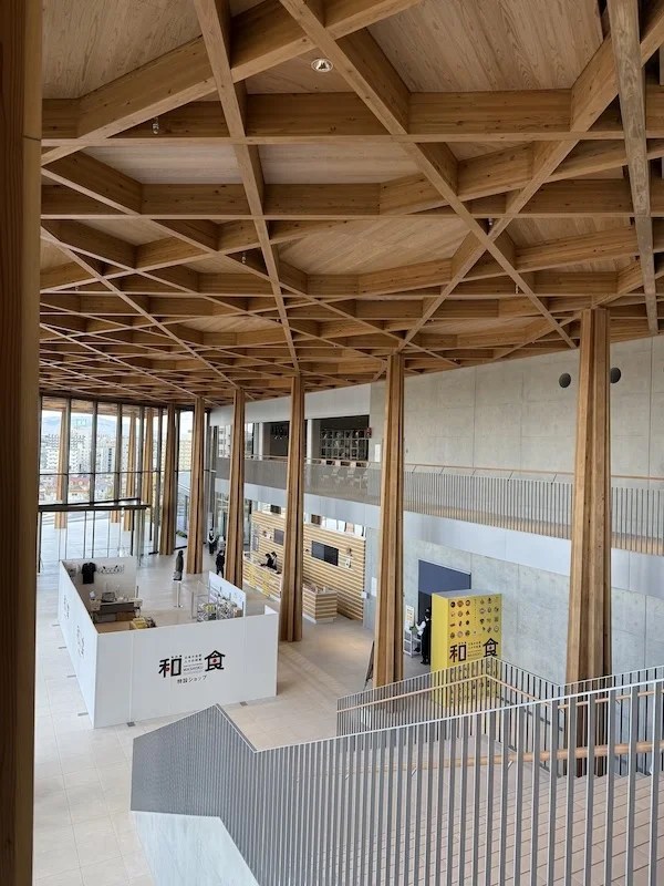大きな木の庇が特徴です。大きな庇というのか、屋根が迫り出しているというのか、その下に入ると木によって構成された幾何学模様に目を奪われます。