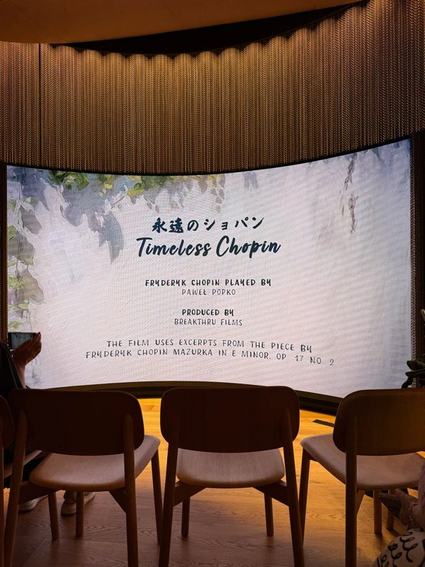 ▲ピアノの反対側にはスクリーンがあって数分間のミニアニメ《永遠のショパン(Timeless Chopin)》が上映されています。