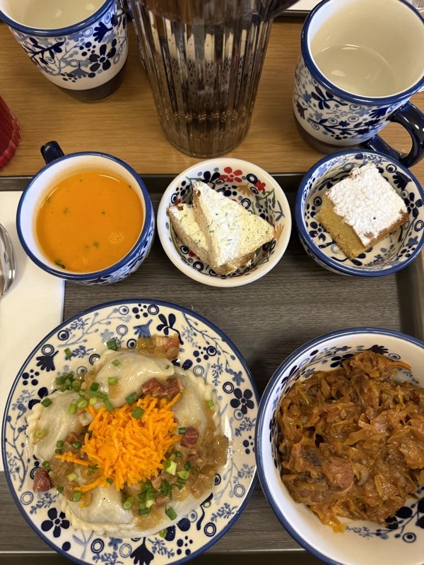 左下が問題の「ピエロギ」。見た目も食感もほぼ日本の餃子です。違いは肉が入っていないことくらいかも。モンゴル帝国が侵略を試みた西端のポーランドと東端の日本に似たような料理があるというのは歴史的な何かを感じさせます