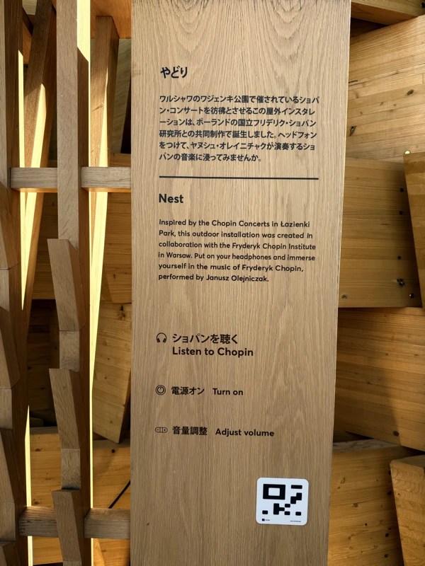 ▲日本産の木材を組み合わせた一見和風の建築のようで、余白を活かしたポーランドの文化を反映させたもの。ポーランドと開催国日本のそれぞれへのリスペクトが感じられるます。そして「余白を活かす」点にポーランドと日本の文化の共通点が見えてきます。
