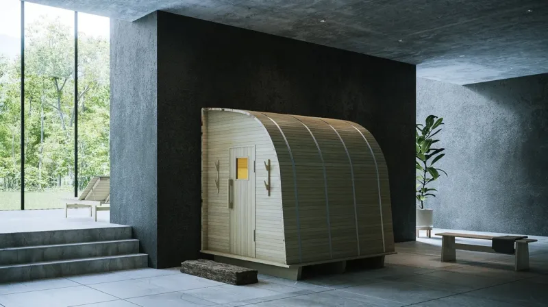▲森林を望む大きな窓があるモダンな空間に、木製のバレルサウナが設置されています。コンクリートの壁と床が特徴的です。