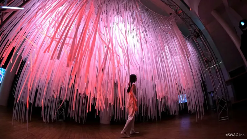 ▲ピンク色の光に照らされた無数のリボンがドーム状に吊り下げられたアートインスタレーションの中を、一人の女性が歩いている幻想的な光景。