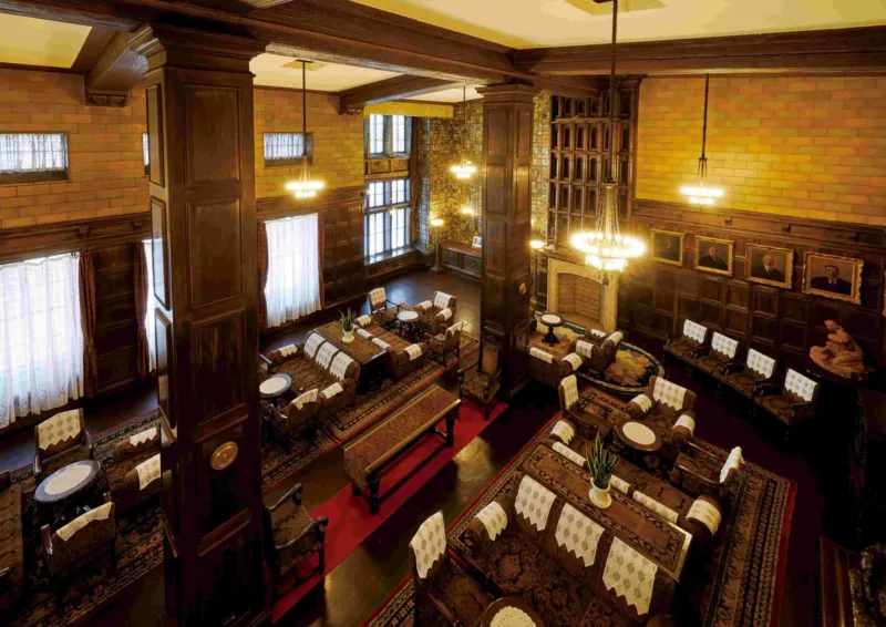 ▲豪華な内装が施された広々としたホールを上から見た画像です。高い天井には木製の梁と柱が目立ち、レンガの壁と木製のパネルが特徴的です。