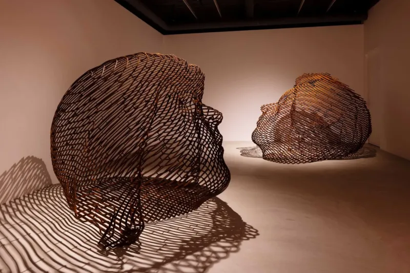 ▲ギャラリー空間に展示された、網目状の素材でできた二つの巨大な抽象彫刻。床には作品の複雑な影が広がっています。