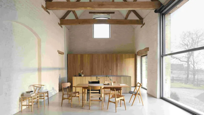 ▲改装された広々とした空間に、モダンで素朴なダイニングエリアと木製キッチンが配置されています。白いレンガの壁と露出した木製の梁が特徴です。