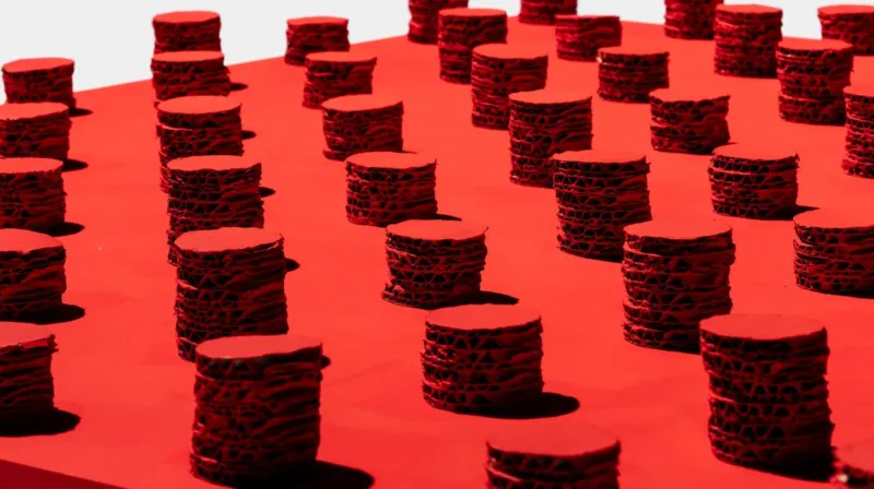▲赤い平面上に、赤く塗られた段ボールの筒状のオブジェが規則正しく並んでいます。層状の構造が特徴的です。