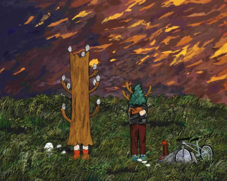▲夕焼けに染まる広大な草原に立つ、木のような姿の人物と鹿の角を持つ人物が描かれた幻想的な絵画。