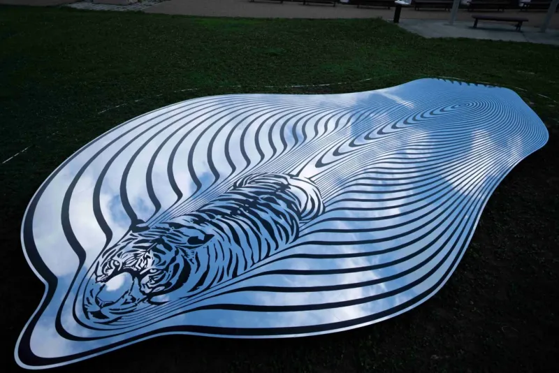 ▲芝生の上に設置された、虎の頭部と縞模様が描かれた反射性のあるアートインスタレーション。空と雲が鏡のように映り込んでいます。