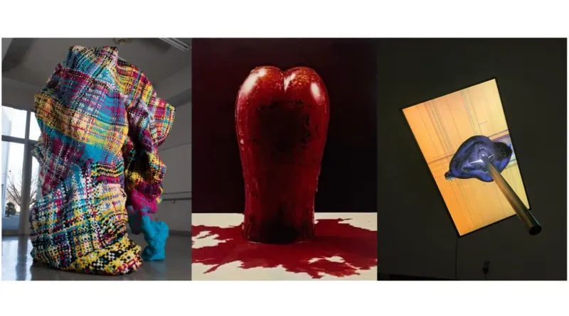 ▲鮮やかな色の織物彫刻、赤い液体が滴る有機的なオブジェ、そして壊れたスクリーンから光が漏れるインスタレーションが含まれる3つの異なる現代アート作品。