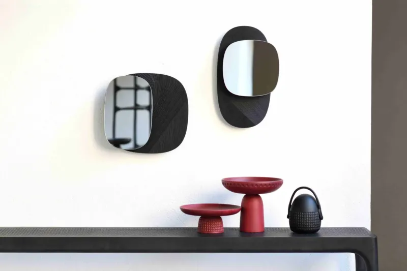▲白い壁に黒いモダンな鏡が2つ、その下の黒いコンソールテーブルには赤い装飾的な器と黒いオブジェが配置された、スタイリッシュでミニマリストなインテリアデザイン。